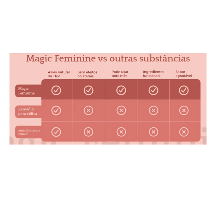 Oferece diversos benefícios para a saúde feminina, incluindo a melhora dos sintomas da menopausa, o aumento da disposição e energia, a proteção contra desequilíbrios femininos, além de contribuir para sintomas de TPM como cólicas e irritabilidade.