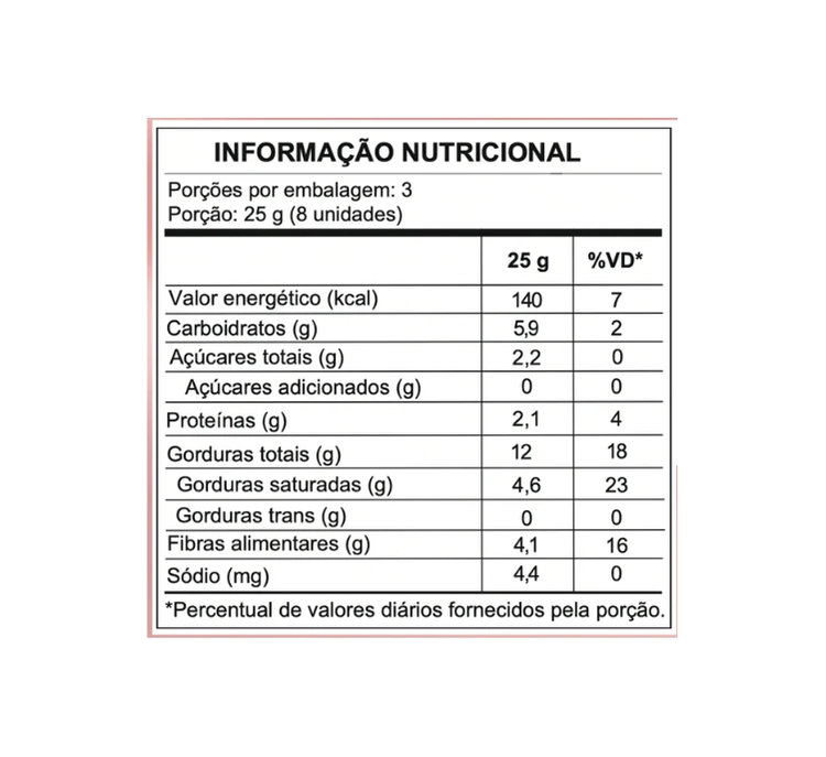 Avelãs, manteiga de cacau, Leite de aveia em pó, fibra de mandioca, stévia andina, taumatina, extrato de hibiscus em pó, goma acácia, extrato de laranja moro (Morosil),óleo de prímula ( Oenothera biennisL.), ácido ascórbico ( vitamina C) e aroma natural. NÃO CONTÉM GLÚTEN. NÃO CONTÉM LACTOSE.