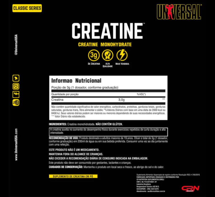 A suplementação com Creatina Universal auxilia no aumento dos estoques e no armazenamento da creatina dentro do músculo, o que é fundamental para a produção da energia usada na contração muscular.