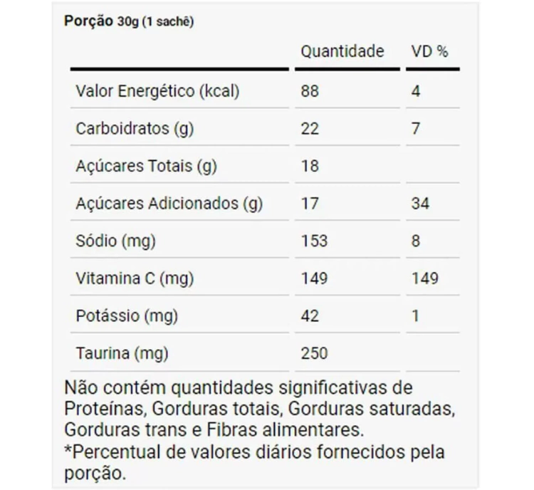 Sacarose invertida enzimática, maltodextrina, água, isomaltulose, taurina, ácido ascórbico, reguladores de acidez citrato de potássio e citrato trissódico, aromatizantes e espessantes goma alfarroba e goma xantana.