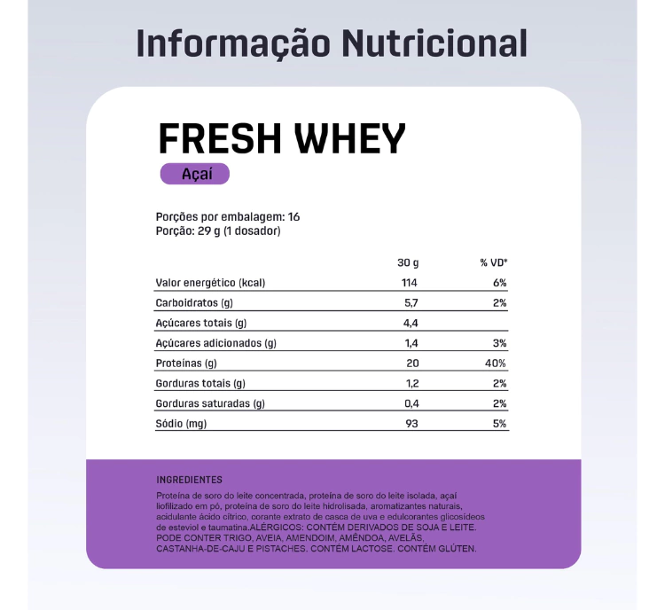 Proteína de soro do leite concentrada, proteína de soro do leite isolada, açaí liofilizado em pó, proteína de soro do leite hidrolisada, aromatizantes naturais, acidulante ácido cítrico, corante extrato de casca de uva e edulcorantes glicosídeos de esteviol e taumatina. ALÉRGICOS: CONTÉM DERIVADOS DE SOJA E LEITE. PODE CONTER TRIGO, AVEIA, AMENDOIM, AMÊNDOA, AVELÃS, CASTANHA-DE-CAJU E PISTACHES. CONTÉM LACTOSE. CONTÉM GLÚTEN.