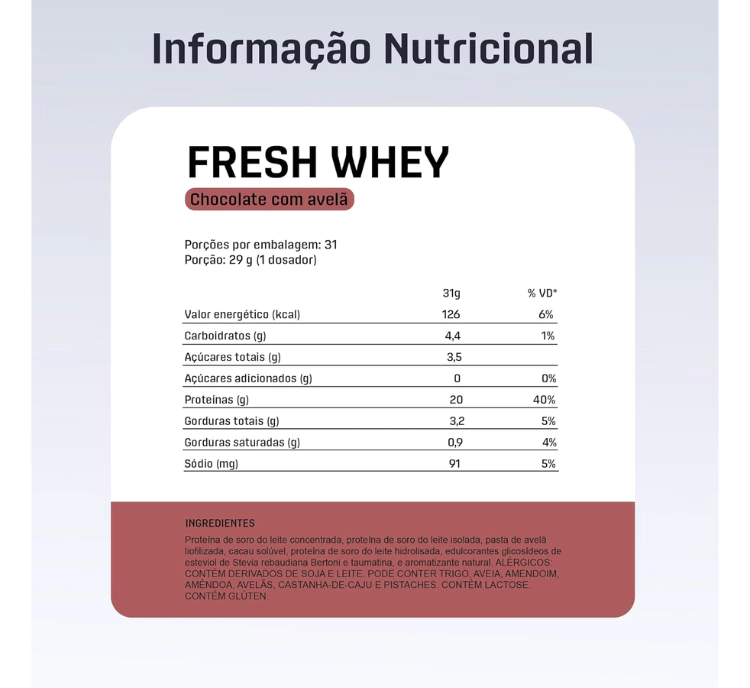 Proteína de soro do leite concentrada, proteína de soro do leite isolada, pasta de avelã liofilizada, cacau solúvel, proteína de soro do leite hidrolisada, edulcorantes glicosídeos de esteviol de Stevia rebaudiana Bertoni e taumatina, e aromatizante natural. ALÉRGICOS: CONTÉM DERIVADOS DE SOJA, LEITE E AVELÃS. PODE CONTER TRIGO, AVEIA, AMENDOIM, AMÊNDOA, CASTANHA-DE-CAJU, CASTANHA-DO-PARÁ E PISTACHES. CONTÉM LACTOSE. CONTÉM GLÚTEN.
