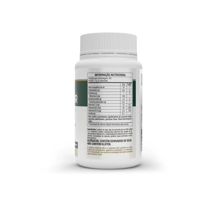 Lecitina de soja, óleo de semente de uva (Vitis vinifera L.), L-metionina, inositol, niacinamida (vitamina B3), acetato de DL-alfa-tocoferol (vitamina E), metilcobalamina (vitamina B12) e corante clorofila. Composição da cápsula: gelatina, água purificada e umectante glicerina.
