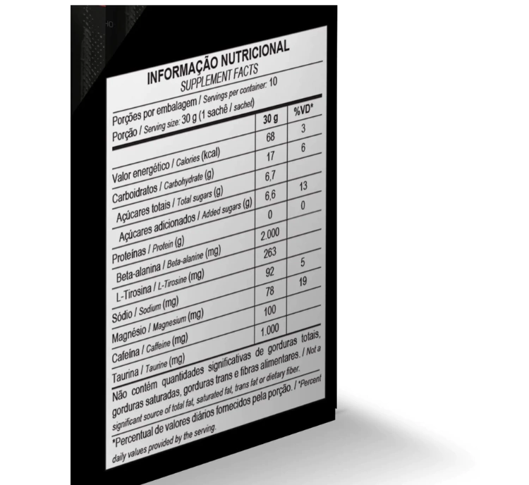 Maltodextrina, água purificada, frutose, beta-alanina, taurina, dextrose monohidratada, L-tirosina, bisglicinato de magnésio, óxido de magnésio, hidróxido de magnésio, cloreto de sódio, cafeína, acidulante ácido cítrico, aromatizantes, espessante goma xantana, reguladores de acidez fosfato de potássio e ácido fosfórico, estabilizante citrato de sódio, edulcorante sucralose, antioxidante ácido ascórbico, conservadores benzoato de sódio e sorbato de potássio e sequestrante EDTA. NÃO CONTÉM GLÚTEN.