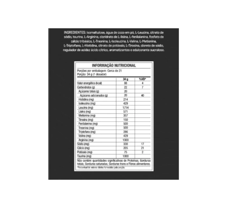 Isomaltulose, L-Leucina, citrato de sódio, taurina, L-Arginina, água de coco em pó, cloridrato de L-lisina, L-fenilalanina, fosfato de cálcio tribásico, L-Treonina, L-Isoleucina, L-Valina, L-Metionina, L-Triptofano, L-Histidina, citrato de potássio, L-tirosina, regulador de acidez ácido cítrico, aromatizantes, corante carmins e edulcorante sucralose.