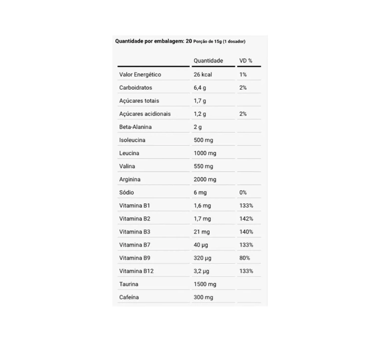 Sabor de pink limonade: L-Arginina, beta-alanina, taurina, L- Leucina (fermentada), mix de vitaminas [dextrose, niacinamida (vitamina B3), riboflavina (vitamina B2), tiamina mononitrato (vitamina B1), ácido fólico (vitamina B9), D-biotina e cianocobalamina (vitamina B12)], L-Isoleucina (fermentada), L-Valina (fermentada), fosfato de cálcio tribásico, preparado de cafeína (maltodextrina e cafeína), isomaltulose (PalatinoseTM), preparado de guaraná e cafeína [maltodextrina, guaraná em pó (Paullinia cupana) e cafeína], antiumectante dióxido de silício, acidulante ácido cítrico, aromatizantes, estabilizante citrato de potássio, corante carmim, edulcorantes sucralose e acesulfame de potássio e emulsificante lecitina de girassol.