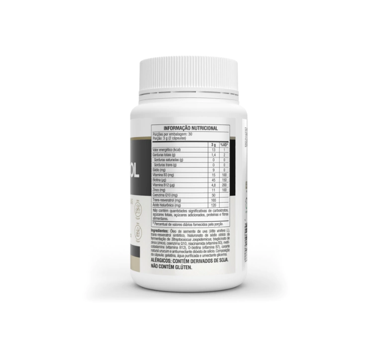 RESVERATROL PLUS® é um suplemento alimentar a base de óleo de semente de uva (Vitis vinifera L.), trans-resveratrol, ácido hialurônico, coenzima Q10, vitaminas B3, B12, biotina e zinco.