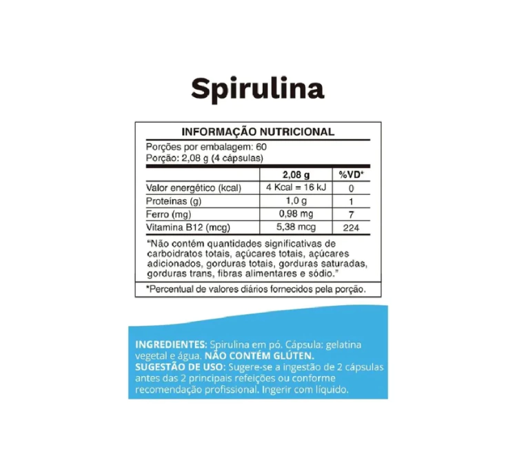 A Spirulina ou espirulina é uma cianobactéria, embora seja comumente chamada de microalga, que pode ser utilizada como um complemento nutricional. Contém uma quantidade significativa de proteínas, vitaminas e minerais que superam muitos alimentos. Esse superalimento está disponível no mercado na forma desidratada em comprimidos, cápsulas ou pó, sendo facilmente encontrado em lojas especializadas em produtos naturais e suplementos. A dosagem e o método de consumo recomendados podem variar de acordo com a finalidade do suplemento.