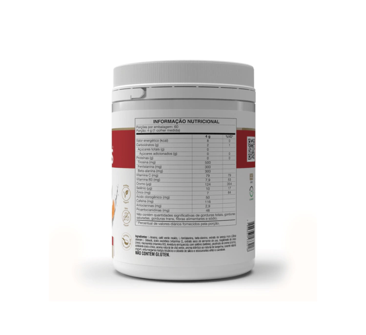 Tirosina, café verde moído, fenilalanina, beta-alanina, extrato de laranja moro (Citrus sinensis L. Osbeck), ácido ascórbico (vitamina C), extrato seco de semente de uva, bisglicinato de zinco (zinco), niacinamida (vitamina B3), levedura enriquecida com selênio (selênio), picolinato de cromo (cromo), acidulante ácido cítrico, aroma natural de chá verde, aroma idêntico ao natural de tangerina, corante natural urucum, antiumectantes fosfato tricálcico e dióxido de silício e edulcorantes xilitol e sucralose.