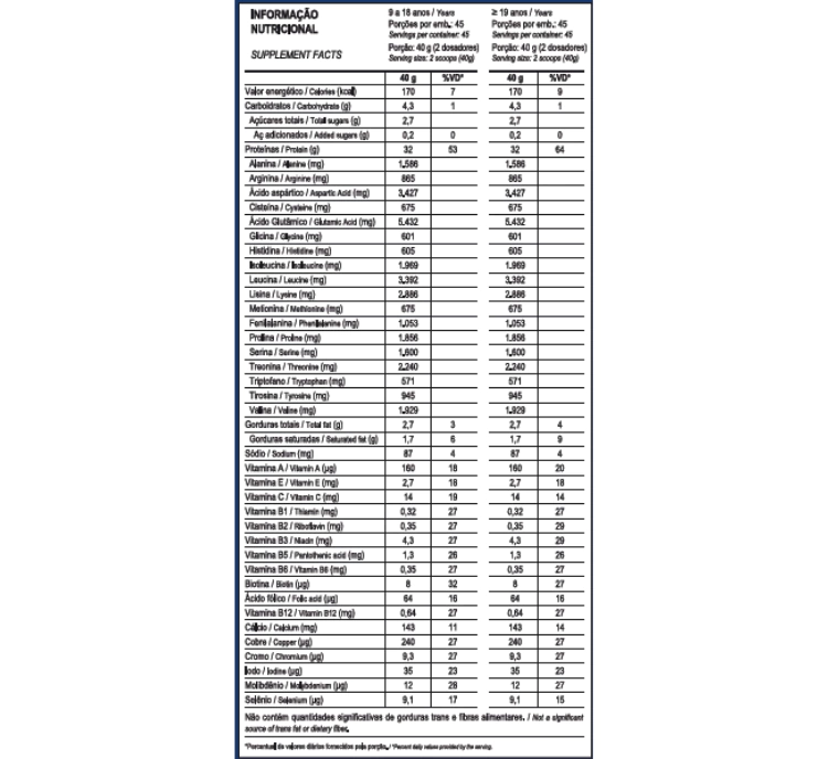 Sabor : Baunilha Proteína concentrada do soro do leite (WPC), proteína isolada do soro do leite (WPI), proteína hidrolisada do soro do leite (WPH), mix de vitaminas e minerais (ácido ascórbico (vitamina C), nicotinamida (vitamina B3), acetato de DL-alfatocoferol (vitamina E), D-pantotenato de cálcio (vitamina B5), cloridrato de piridoxina (vitamina B6), riboflavina (vitamina B2), tiamina mononitrato (vitamina B1), sulfato cúprico (cobre), acetato de retinol (vitamina A), ácido fólico, iodeto de potássio (iodo), molibdato de sódio (molibdênio), picolinato de cromo (cromo), selenito de sódio (selênio), Dbiotina (vitamina H), cianocobalamina (vitamina B12)), emulsificante lecitina de soja*, aromatizante e edulcorante sucralose.