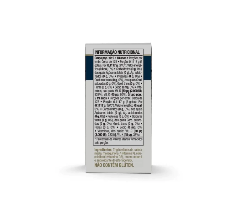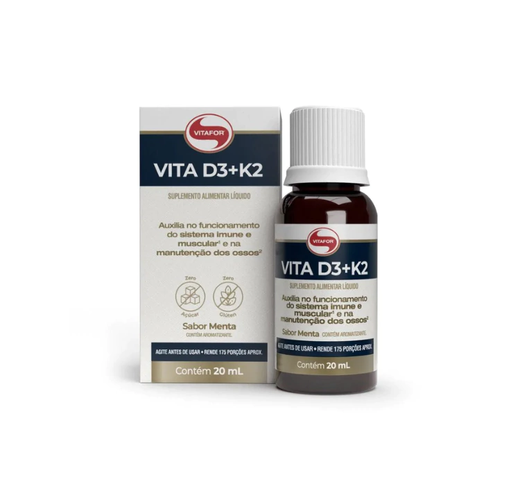 VITA D3 + K2® Vitafor é um suplemento alimentar rico em vitaminas D3 (colecalciferol) e K2 (menaquinona-7) e que possui alta concentração de D3 por dose (2.000 UI).